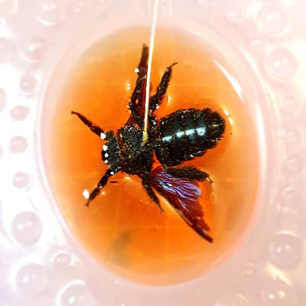 Why checking the clock all the time? You need to find that sweet spot to remove the wire and keep your critter in position. You see, some insects tend to float to the surface once they’re released from the wire. When you find that gooey tree sap-like timeframe, you can slowly remove the wire while rotating and pulling it out of the mold (like a screw). The void where the wire was will automatically fill with resin so there won’t be any wire trail visible if done right.