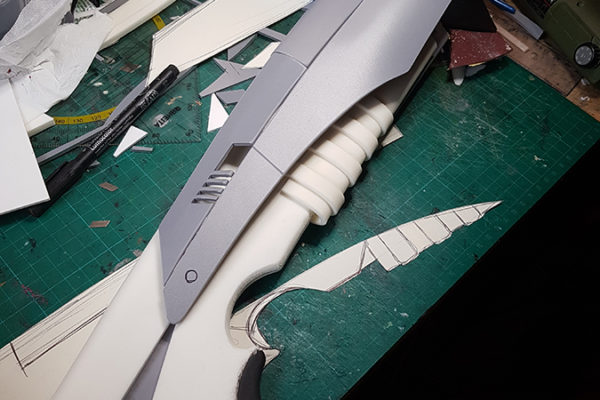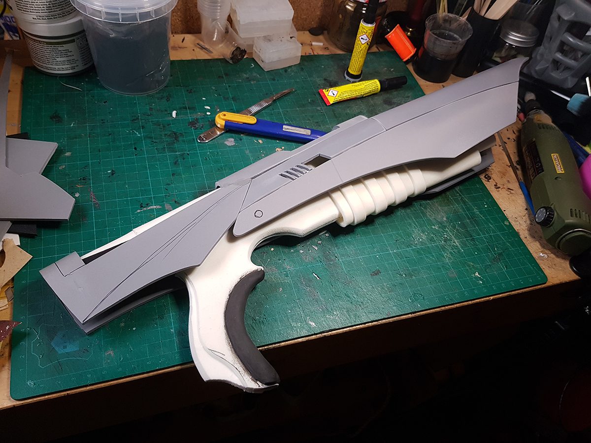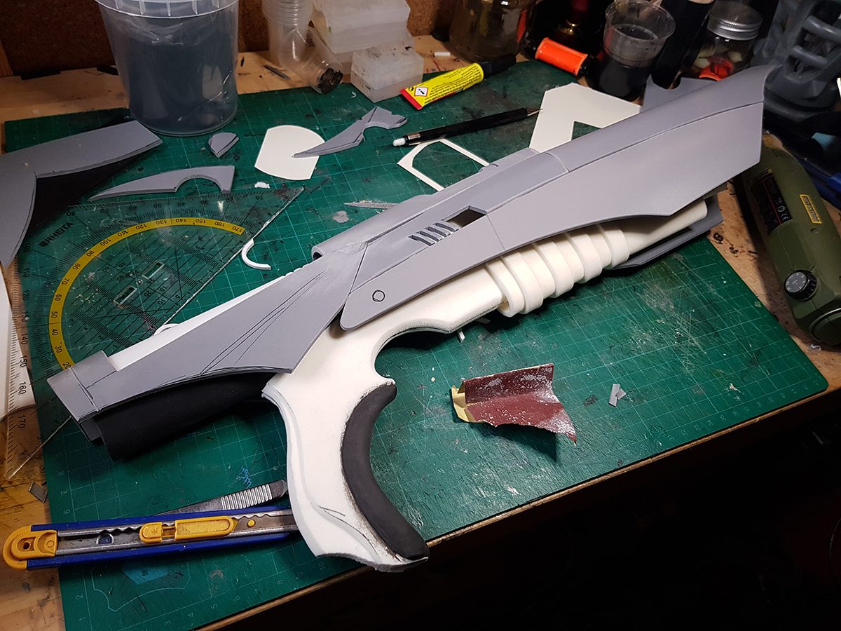 Skip to main contentI mostly worked with different types of foam and used the PVC sheets to build the outer shell as it had to look flawless as a sci-fi gun. The black grip of the gun was sculpted with foam clay and when cured it’s soft so it feels like a rubber grip.