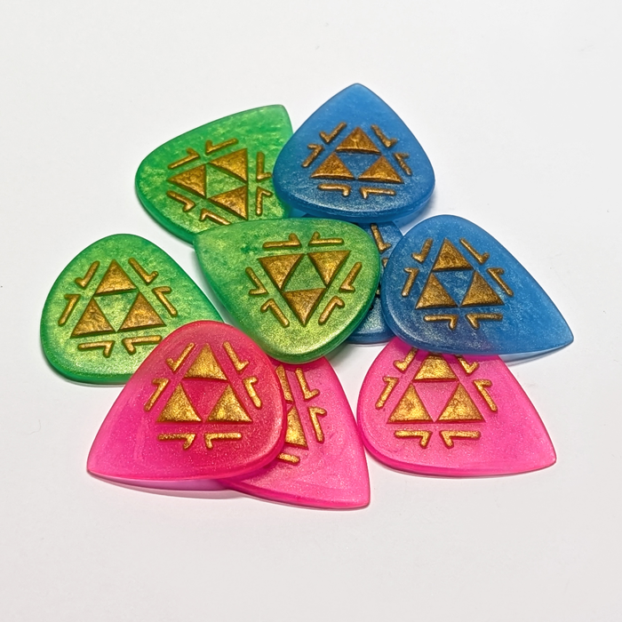 It’s a sturdy piece cast in resin and features a golden triforce in the center of the plectrum, with the resin displaying an iridescent color.
