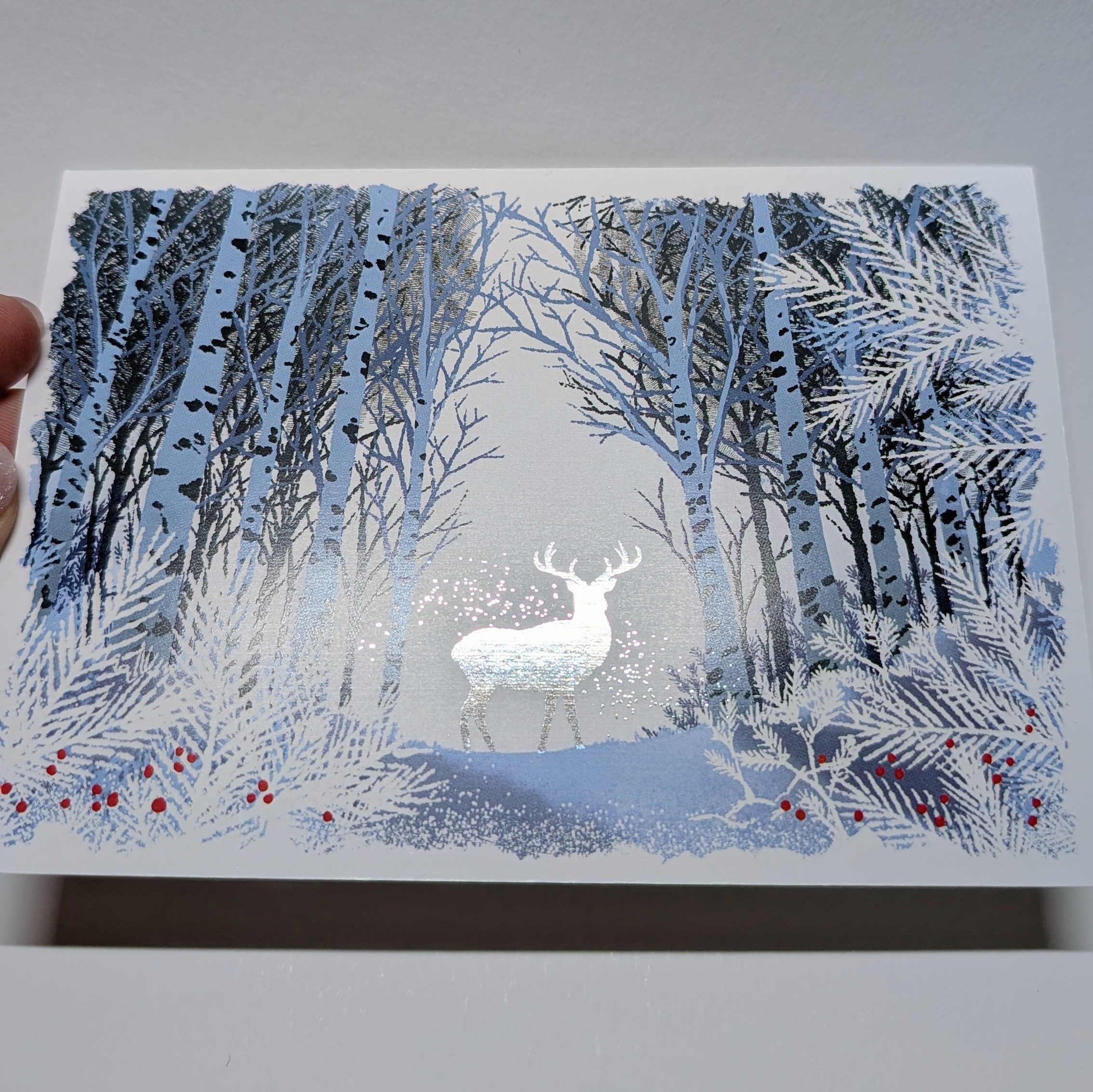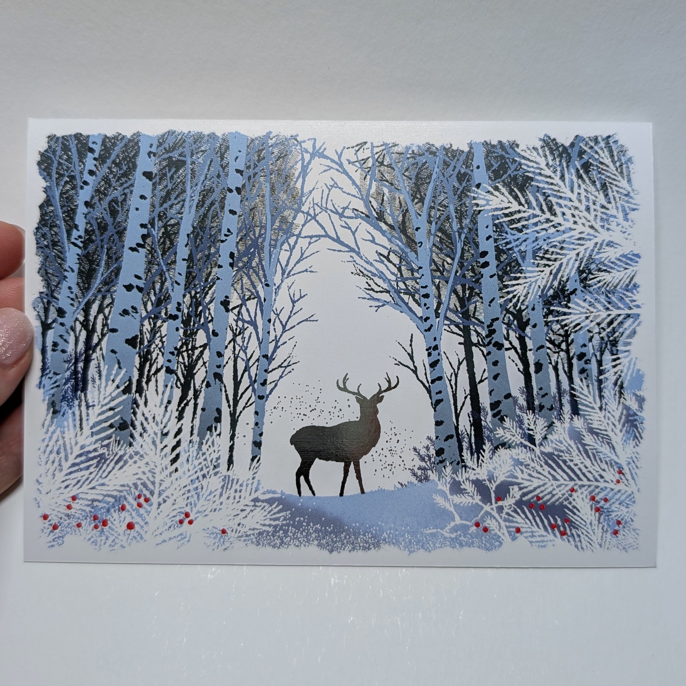 A greeting card featuring a winter deer motif, illustrated by me.The deer is highlighted in digital silver foil, and the back of the card is left blank for your message.